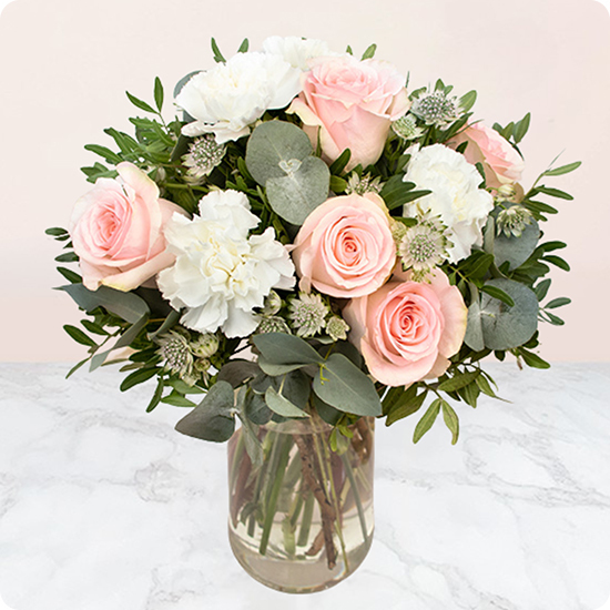 Breng een vleugje verfijning en delicatesse met het boeket Aura van Tederheid. De compositie in pasteltinten, met een mix van zachte rozen en onberispelijke witte bloemen, is het perfecte boeket om oprechte en zachte gevoelens te uiten.