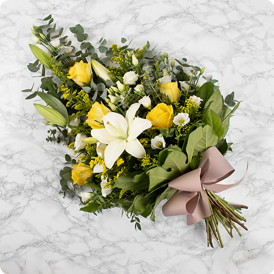 De Kéa-rouwschoof is een lichte en verfijnde bloemencompositie, ontworpen om een moment van bezinning met tederheid te vergezellen. Het combineert witte lelies, gele rozen en witte bloemen in een geheel dat gestructureerd is met eucalyptus en ander fijn groen. Dit langwerpige boeket, versierd met een zacht lint, symboliseert licht, hoop en vrede.