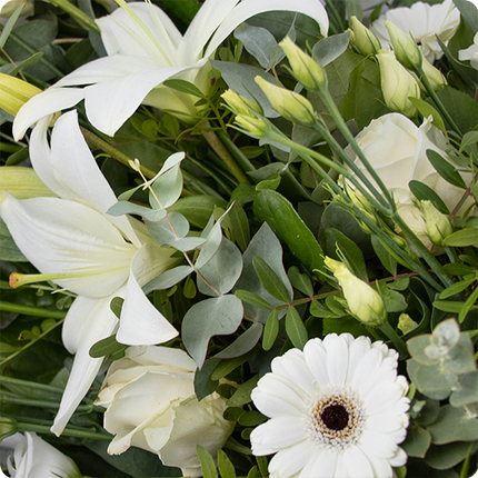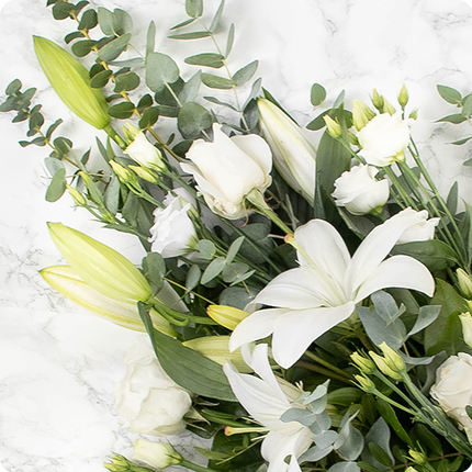 Het Memory-bloemstuk is een eerbetoon vol vrede en waardigheid. Samengesteld rond majestueuze witte lelies, witte rozen, germini's en lichte lisianthus, wordt het verfijnd door licht eucalyptusblad voor een natuurlijk en luchtig resultaat. Deze compositie in onberispelijke tinten roept sereniteit en licht op.