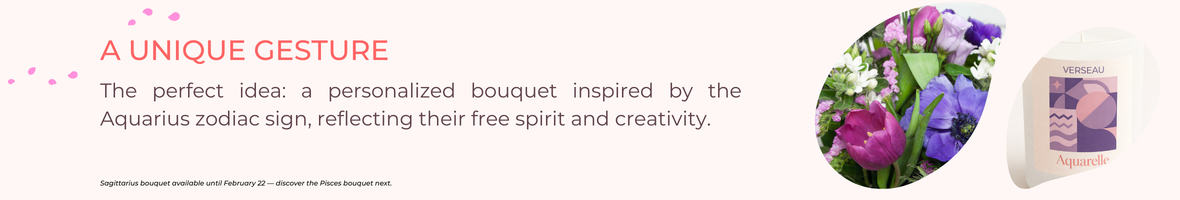 Unpredictable, visionary and resolutely free-spirited, Aquarius is expressed through a bouquet with a bold character and an audacious harmony. This floral creation combines shades of purple, blue and pink, enhanced with touches of white and green, for a modern, airy and inspiring result.
